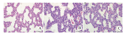 A,B和C分别为SO、APILP和SB组胎鼠肺脏组织(H & E染色,×400) 图 1 各组胎鼠肺脏的病理改变 Fig 1 Morphological changes of fetal lungs in each group
