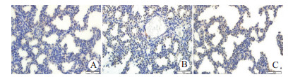 注:A,B和C分别为SO、APILP和SB组胎鼠肺脏,其中黄褐色细胞即为NF-κB阳性细胞(免疫组织化学染色×400) 图 2 各组胎鼠肺脏中NF-κB的表达情况 Fig 2 NF-κB expression in fetal lungs in each group