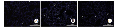 注:A,B和C分别为SO、APILP和SB组妊娠大鼠的胰腺组织; 胞浆内可见明显绿色荧光的细胞为MPO阳性表达)(免疫荧光染色×200) 图 3 各组胎鼠肺脏中MPO的表达情况 Fig 3 MPO expression in fetal lungs in each group