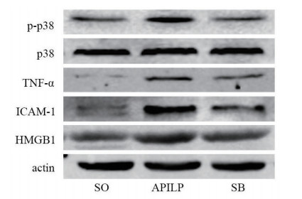 与SO组比较,APILP组胎肺中p-p38MAPK(q=29.74,P < 0.05)、TNF-αq=37.42,P < 0.05)、ICAM-1(q=21.98,P < 0.05)、HMGB1(q=17.28,P < 0.05)的表达水平显著增加; SB20358干预后,胎肺中p-p38MAPK(q=27.59,P < 0.05)、TNF-αq=20.58,P < 0.05)、ICAM-1(q=13.85,P < 0.05)和HMGB1(q=7.36,P < 0.05)的表达水平较APILP组显著减少,但除p-p38MAPK外仍高于SO组(q=2.15,P > 0.05;q=16.85,P < 0.05;q=8.13,P < 0.05;q=9.93,P < 0.05),见图 4表 2