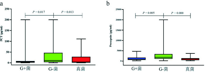 计量资料以中位数(四分位数间距)MIQ)表示,组间比较采用Kruskal–Wallis H检验。绘制ROC曲线,结合Logistic回归方法联合presepsin和PCT,比较presepsin和PCT区分脓毒症患者G-菌感染与G+菌、真菌感染的准确性。所有数据均由SPSS16.0统计软件完成,以P < 0.05为差异有统计学意义。