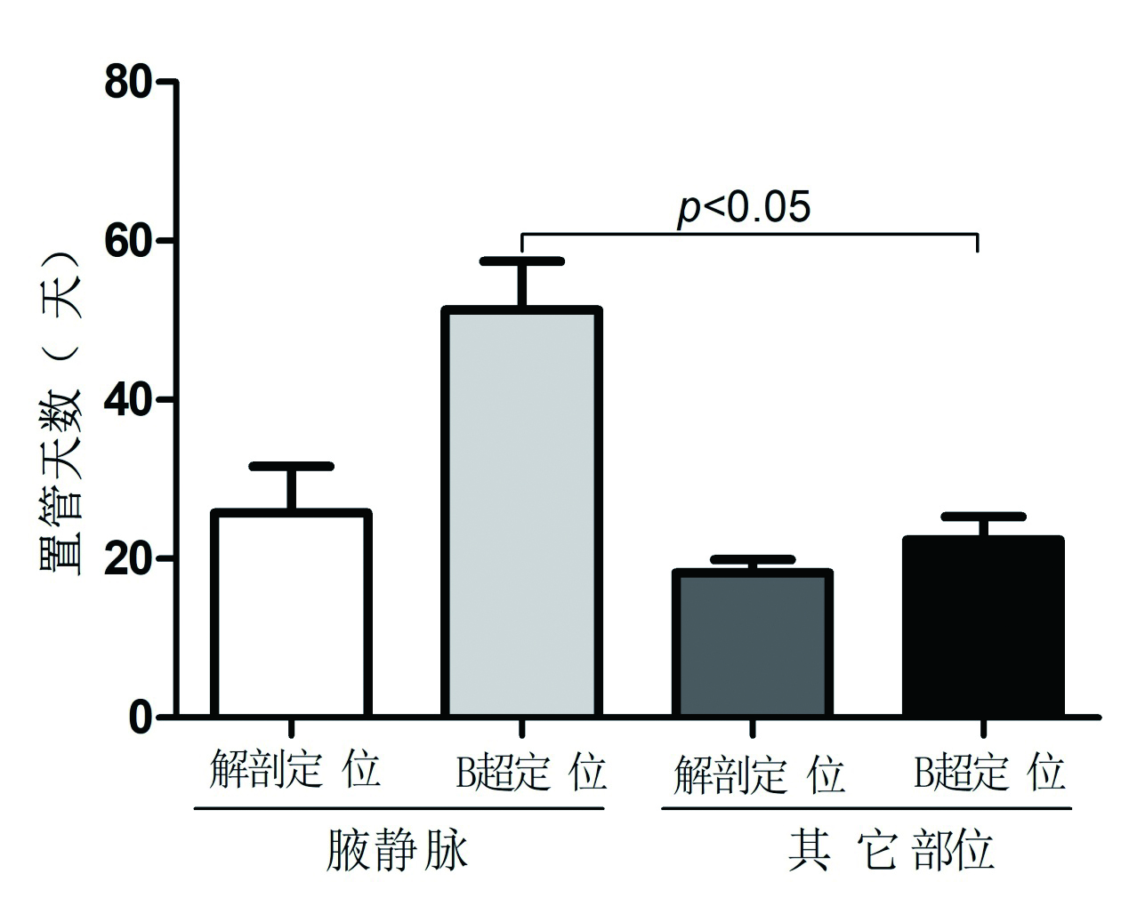 | 图 1 不同定位方式患者置管留置时间 Fig 1 Time of indwelling catheter in patients with different positioning methods |
