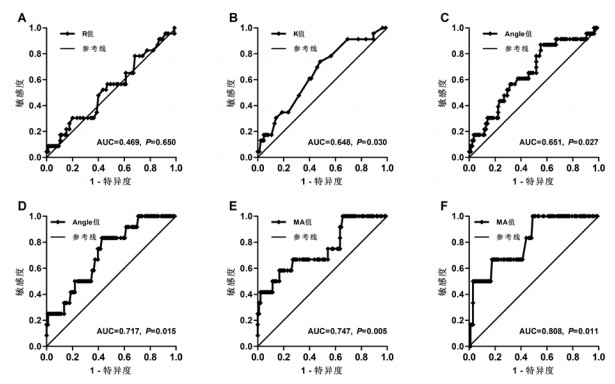 根据具有相似临床价值的TEG和CCTs参数,分析两者间的相互诊断价值。本研究中,以R值判断APTT < 23 s的敏感度和特异度分别为69.6%、63.5%,曲线下面积(area under the curve,AUC)为0.469(P=0.645)(图 1A),表明R值对预测APTT降低(高凝状态)无诊断价值。以K值判断TT > 20 s的敏感度和特异度分别为73.9%、48.2%,AUC为0.648(P=0.030)(图 1B);以Angle值判断TT > 20 s的敏感度和特异度分别为87.0%、55.3%,AUC为0.651(P=0.027)(图 1C),表明K值和Angle值对预测TT升高(低凝状态)具有较低的诊断价值。以Angle值判断FIB > 4 g/L的敏感度和特异度分别为83.3%、42.7%,AUC为0.717(P=0.015)(图 1D);以MA值判断FIB > 4 g/L的敏感度和特异度分别为58.3%、16.7%,AUC为0.747(P=0.005)(图 1E);以MA值判断PLT > 300×109/L的敏感度和特异度分别为99.0%、49.0%,AUC为0.808(图 1F),表明Angle值和MA值对FIB、PLT水平升高(高凝状态)具有中等的预测价值。TEG参数判断CCTs结果异常的最佳截断点的结果见表 5
