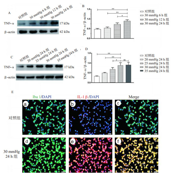 A-D:Western Blot t检测各组TNF-α蛋白表达,aP < 0.05,bP < 0.01,nsP > 0.05; E: Iba1+小胶质细胞(a、d,绿色),TNF-α(b、e,红色),TNF-α和小胶质细胞的共定位(c、f);水平标尺:10 μm 图 1 高压力上调BV2小胶质细胞TNF-α的表达(n=3) Fig 1 High pressure up-regulated TNF-α expression of BV2 microglia