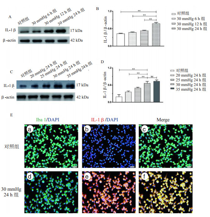 Western Blot结果显示:30 mmHg压力处理BV2小胶质细胞24 h后,IL-1β的表达明显高于对照组(P < 0.01)、6 h组(P < 0.01)和12 h组(P < 0.01)。见图 2A, B。30 mmHg组IL-1β的表达水平明显高于对照组(P < 0.01)、20 mmHg组(P < 0.01)、25 mmHg组(P < 0.01)。30 mmHg组与35 mmHg组比较,IL-1β的表达差异无统计学意义(P > 0.05)。见图 2C, D。免疫荧光结果显示:与对照组比较,30 mmHg压力处理后BV2小胶质细胞红色荧光的表达强度(IL-1β的表达)明显升高。见图 2E
