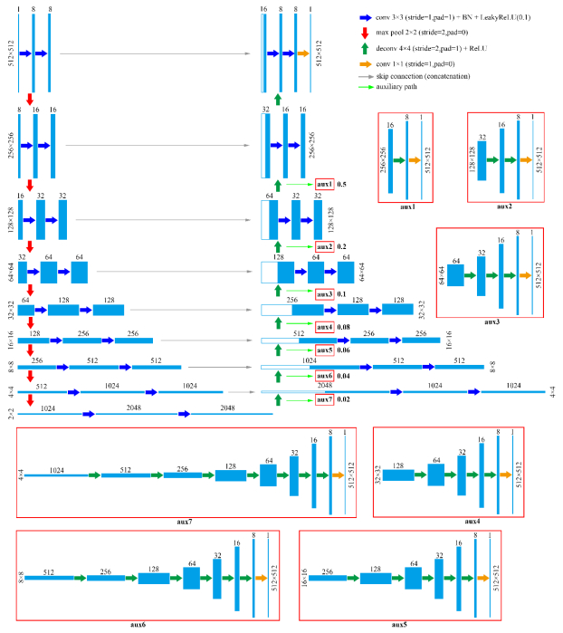 其收缩路径包括9个编码块,每个编码块包含两个3×3卷积层(步长为1,零填充数为1),每个卷积层后添加有一个批量归一化层(batch normalization,BN层,加速网络收敛)和一个Leaky ReLU激活层(负轴斜率为0.1,使得负轴信息不会全部丢失,一定程度上防止Dead ReLU问题),每个编码块利用一个2×2最大池化层(步长为2,无零填充)进行下采样,将特征图大小减半,到下一个编码块的第一个3×3卷积层,将特征通道数加倍。