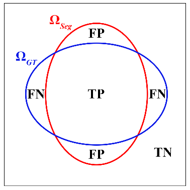 图 2 分割结果和金标准(GT)得到的两个区域ΩSeg(红色轮廓包围)和ΩGT(蓝色轮廓包围)的示意图
