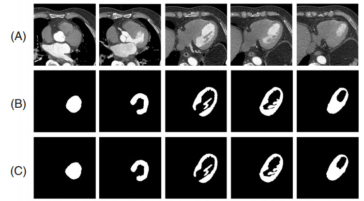 (A):原图;(B):金标准;(C):本文方法的分割结果 图 3 一例患者的5幅左心室图像及其相应的分割结果