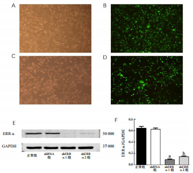 | shERRα1组为正常细胞感染shERRα1序列;shERRα2组为正常细胞感染shERRα2序列。正常大鼠PMVECs的细胞形态(A、C)以及感染72 h后,倒置荧光显微镜下观察的绿色荧光蛋白GFP的表达量(B、D)(×100);Western Blot检测四组细胞内ERRα的表达量(E、F);与正常组及shRNA组比较,a P < 0.01;与正常组及shRNA组比较,b P < 0.01 图 1 大鼠PMVECs的形态及感染效率 Fig 1 Infection efficiency and morphology of rat PMVECs |