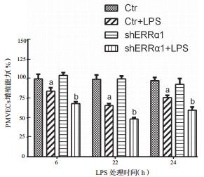 1 材料与方法 1.1 实验材料与试剂大鼠PMVECs细胞购买于北京北纳创联生物技术研究院;重组慢病毒shERRα的构建、包装、扩增、鉴定和纯化,及滴度为9.59×108 TU/mL的shERRα1(靶序列shERRα1:5’- ACTCTGACTCCGTGCACATTGCTC -3’; shERRα2:5’-AGGCAAAGTCCTGGCCCATTTCTC -3’)和慢病毒空白载体由武汉锐博生物科技有限公司完成。DMEM/F12培养基、胎牛血清(FBS)和胰酶购买于美国Gibco公司,T25细胞培养瓶、六孔板购买于美国Corning公司,Escherichia coli O26:B6 LPS购买于美国Sigma公司,并溶解于无菌PBS中。