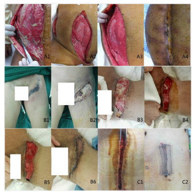 | A:例1钝性挫伤后腹壁坏死性筋膜炎;A1-A2:清创手术前后;A3-4:伤口换药后二期愈合;B:例2会阴坏死性筋膜炎(福尼尔坏疽);B1-5:术前及4次清创手术治疗后;B6:游离皮瓣移植术后;C1-2:例3腹壁切口感染真空封闭引流治疗前后 图 1 软组织感染的外科治疗效果 Fig 1 Surgical treatment effects of soft tissue infections |