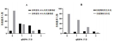 | A:诊断感染48 h内发生脓毒症患者的qSOFA评分;B:住院期间发生脓毒性休克患者的qSOFA评分 图 2 脓毒症和脓毒性休克患者的qSOFA评分 Fig 2 qSOFA score of patients with sepsis and septic shock |