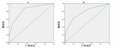| A:qSOFA诊断脓毒症的受试者工作特征曲线;B:qSOFA诊断脓毒性休克的受试者工作特征曲线 图 3 qSOFA诊断脓毒症和脓毒症休克的受试者工作特征曲线 Fig 3 The receiver operating characteristic curve of qSOFA score for diagnosis of sepsis and septic shock |