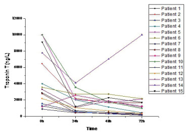 | 图 1 15例存活患者72 h内肌钙蛋白T变化情况 Fig 1 The change of troponin T within 72 h in 15 survival |