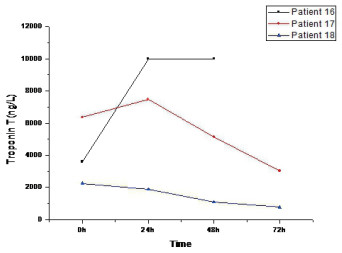 | 图 2 3例死亡患者72 h内肌钙蛋白T变化情况 Fig 2 The change of troponin T within 72 h in 3 non-survival patients |