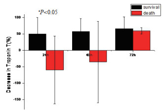 | 图 3 存活组与死亡组之间肌钙蛋白T下降率的比较 Fig 3 The decrease rate of troponin T between the survival group and non-survival group |