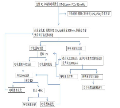 | 图 1 急性PQ中毒伴呼吸困难患者应用HFNC治疗流程图 Fig 1 Diagram of HFNC for patients with dyspnea induced by acute PQ poisoning |