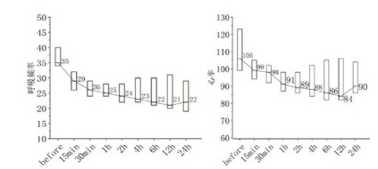 | 箱式图上下代表四分位数QL和QU,图中数值为中位数 图 2 患者应用HFNC后RR和HR随时间变化规律 Fig 2 Changes of RR and HR in patients with HFNC |