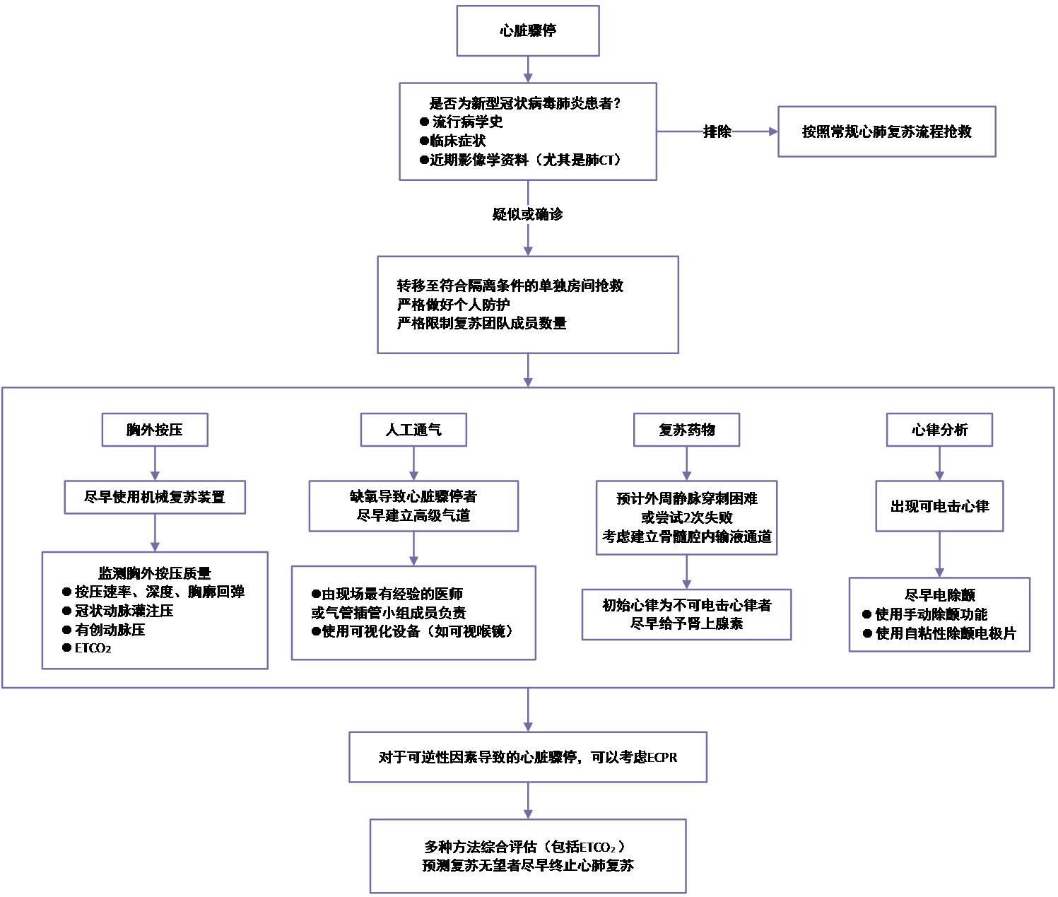 9 疑似/确诊新型冠状病毒肺炎患者心脏骤停ECPR的时机推荐意见18:对于可逆性因素导致的心脏骤停,经过传统心肺复苏不能恢复自主循环或反复心脏骤停不能维持自主心律者,可以考虑ECPR。