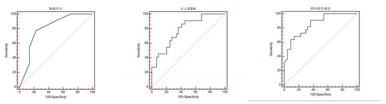 使用ROC曲线检验肺超评分、左心室E/e’、肺动脉收缩压在预测心源性肺水肿NPPV失败的效能。结果显示肺超评分、左心室E/e’和肺动脉收缩压的AUCs依次为0.802、0.783和0.853。进一步使用MedCalc软件计算,肺超评分的最佳截断值为≥22,敏感度77.3%,特异性为77.3%,左心室E/e’的最佳截断值为≥13.1,敏感度90.9%,特异性54.5%,肺动脉收缩压的最佳截断值为≥30.3 mmHg,敏感度90.9%,特异性63.6%。见图 1表 3