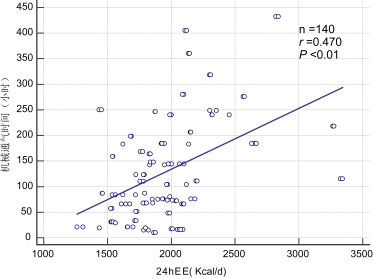 | 图 1 多发伤患者机械通气时间与24 h EE相关性 Fig 1 Correlation between mechanical ventilation time and 24 h EE in patients with multiple trauma |