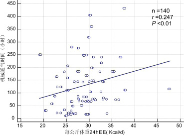 患者的机械通气时间与24 h能量消耗、每千克体质量24 h能量消耗成正相关,相关系数分别为r=0.478,r=0.247,均P < 0.01;ICU住院日与24 h能量消耗成正相关,相关系数r=0.277,P < 0.01,与每千克体质量24 h能量消耗无相关性,相关系数r=0.026,P=0.760(图 1~4)。