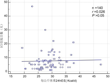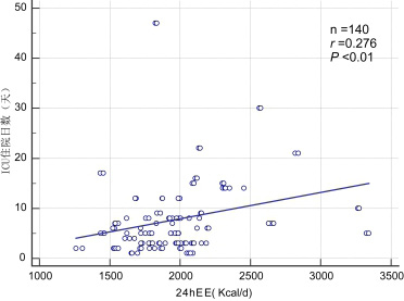 | 图 3 多发伤患者ICU住院日与24 h EE相关性 Fig 3 Correlation between length of stay in ICU and 24 h EE in patients with multiple trauma |
