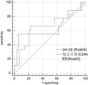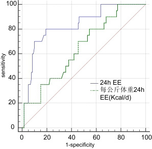 | 图 6 24 h EE、24 h每千克体质量EE对多发伤患者院内感染预测的ROC曲线 Fig 6 ROC curve of 24 h EE and 24 h EE per kilogram of body weight for prediction of hospital-acquired infection in patients with multiple trauma |