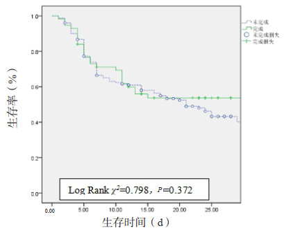 | 图 2 执行1 h Bundle患者的28 d生存曲线 Fig 2 Survival curve for patients with 1 h Bundle completion at 28 days |