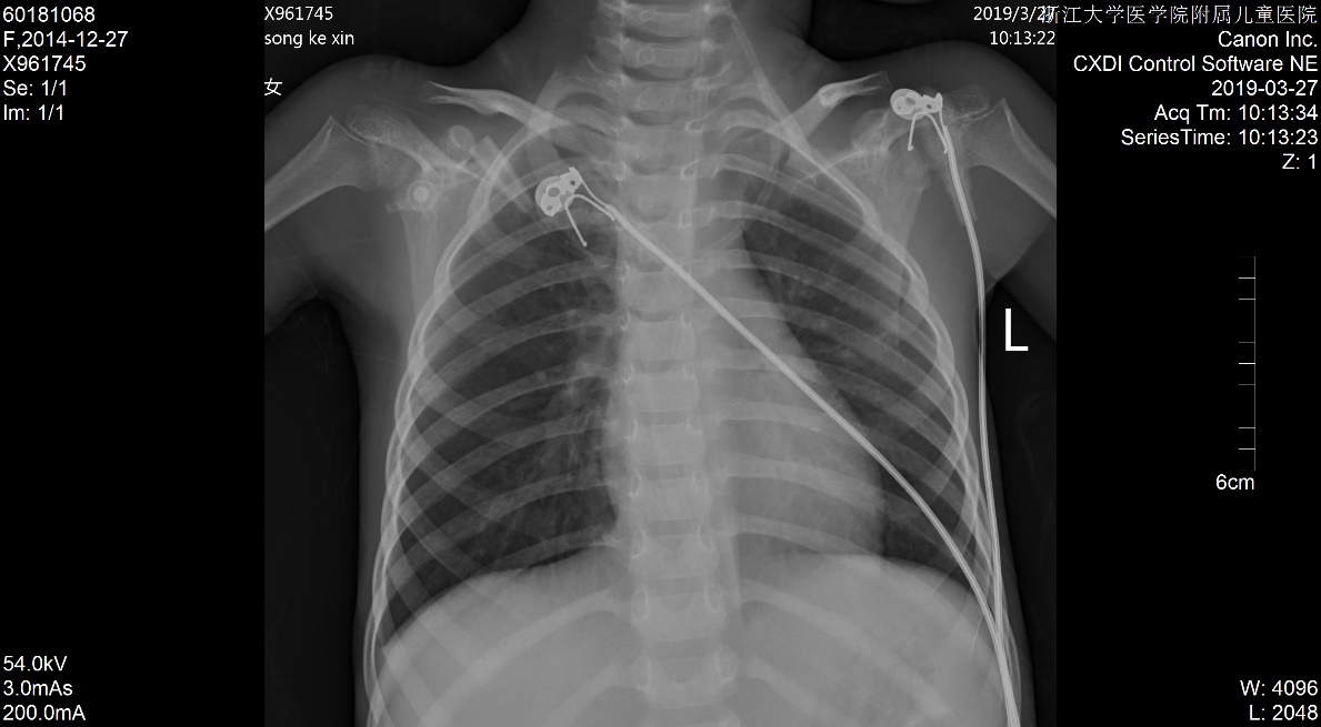 急性呼吸窘迫综合征(ARDS)是糖尿病酮症酸中毒(DKA)的一种罕见并发症,但其病死率很高。1982年Carrol和Matz[6]报道了9例DKA合并ARDS的病例,并描述了此前文献报道过的所有9例DKA合并ARDS的病例,总结发现所有18例病例均为成人,并伴有严重酸中毒及低血压,且其中15例死亡。目前认为,严重的酸中毒、低血压、氮质血症、及可能无法避免的过度液体治疗为DKA合并ARDS的危险因素。本病例可能的机制为:①本病例初诊断时pH为6.87,为极重度糖尿病酮症酸中毒,而严重酸中毒会增加毛细血管通透性,从而导致肺泡表面活性物质活性下降[2];②本病例外院治疗时,液体入量约3 L/24 h,对于体质量10 kg左右的儿童,液体入量极大,而过度水化会增加静水压和减少血管内胶体渗透压,从而可能增加ARDS发生风险[10];③在DKA的发生及治疗过程中,抗炎细胞因子白介素-10显著减少,而前炎症因子白介素-1β、白介素-8及肿瘤坏死因子-α增加,且其间质性肺水肿的发生与各炎症因子的增强同步,这进一步说明了其在ARDS弥漫性肺损伤中的作用;④虽然有些DKA病例,都曾暴露于以上危险因素,但仍只有少数患者出现ARDS,究其原因,可能有一定的基因易感性。目前研究发现,血管紧张素转换酶基因、肺表面活性物质相关蛋白B、白介素-6、血管生成素-2及凝血因子V等的基因多态性与ARDS易感相关。本院内分泌科开设25年来,随着儿童糖尿病发患者数的上升,而儿童1型糖尿病多以DKA就诊,现每年收住DKA患者约50多例次,其中不乏pH值低于6.9的,且伴随低血压的,但DKA合并ARDS为第一例,基因易感性加上多因素共同作用也许能解释其中原因。目前针对ARDS的主要治疗方案是积极治疗潜在病因、机械通气及高流量氧疗,必要时可应用VV-ECMO[7]。而本病例患儿,经过积极治疗后,随访近1年,无明显后遗症生存状态。