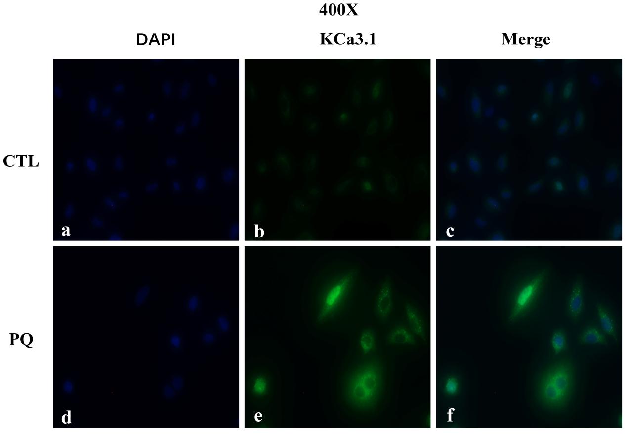 2 结果 2.1 PQ染毒后KCa3.1表达明显增加体外培养A549细胞,分为对照组与染毒组。免疫荧光下检测A549细胞中KCa3.1的表达,染毒组可见绿染的KCa3.1表达明显增加,见图 1。