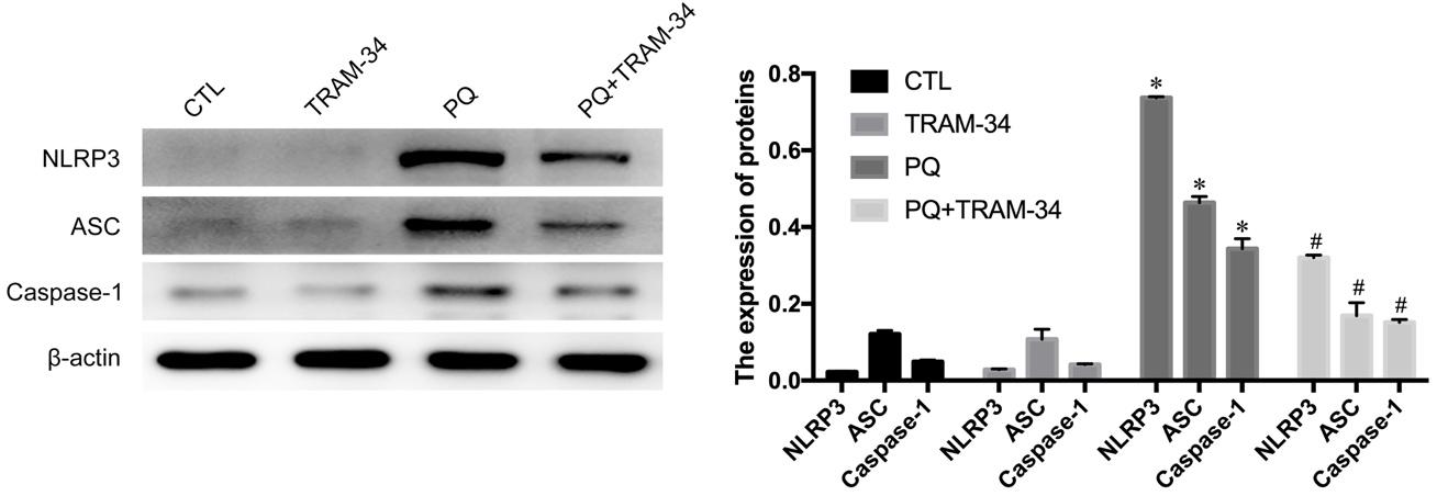 构建PQ染毒肺泡上皮细胞(A549细胞)模型,同时给与KCa3.1抑制剂TRAM-34,观察细胞NLRP3炎症小体激活变化。结果显示,PQ处理后,A549细胞内NLRP3炎症小体明显激活,阻断KCa3.1后,NLRP3、ASC、Caspase-1表达明显减少(图 2),说明KCa3.1参与调控PQ中毒诱导的NLRP3炎症小体激活。