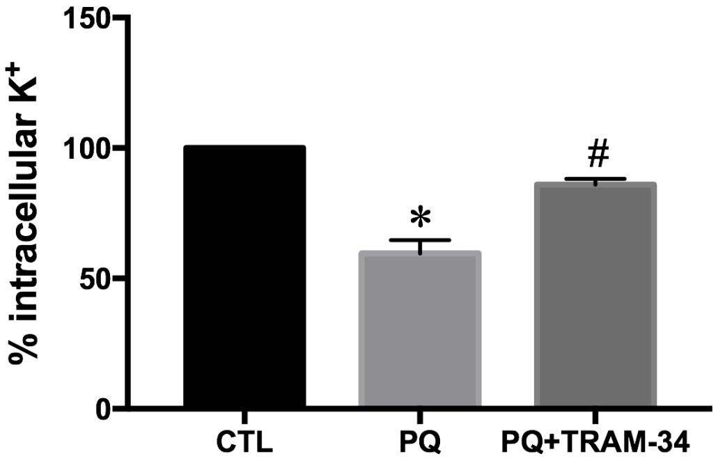 利用细胞钾离子化学比色法检测试剂盒检测细胞内钾离子变化。结果显示,PQ处理后细胞内钾离子明显下降,而抑制KCa3.1后细胞内钾离子下降明显减少(图 3),说明KCa3.1通道参与PQ诱导的细胞内钾离子外流。