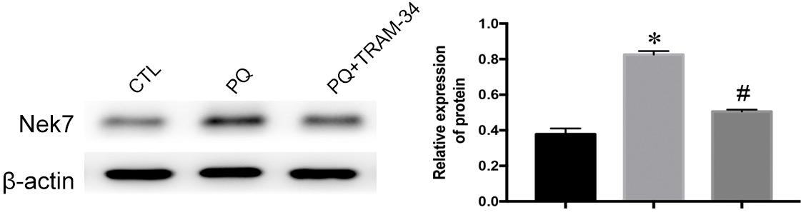 采用Western Blot检测NEK7的表达。结果显示,与对照组相比,PQ组中NEK7表达明显升高,抑制KCa3.1后NEK7表达明显下降(图 4),说明NEK7可能参与PQ中毒诱导的肺纤维化,并可能受KCa3.1调节。