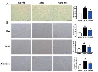 A:大鼠心室肌TUNEL染色。B:大鼠心肌凋亡相关蛋白表达情况。与假手术组相比:aP<0.05;与CLP组相比,bP<0.05 Immunohistochemistry 图 2 TUNEL和免疫组织化学检测评价心室肌凋亡改变 Fig 2 Ventricular myocyte apoptosis was measured by TUNE and Immunohistochemistry