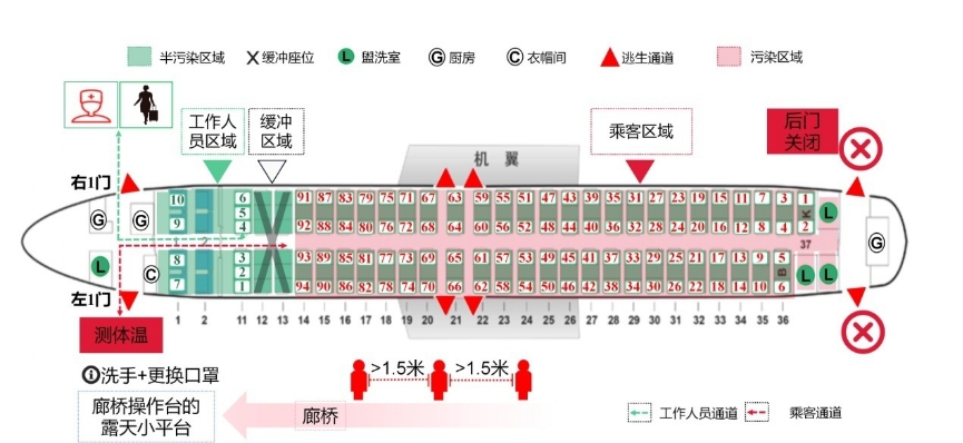 ① 登机流程:提前在值机柜台放置手消毒物品及一次性口罩,保证每位值机旅客均佩戴口罩,广播登机流程及注意事项,安排旅客登机前用餐;尽量让旅客从飞机后门登机,前门作为工作人员通道。最优方案是选择空旷停机坪和客梯车登机,尽量不使用廊桥,若必须使用廊桥,则单次指引十人进入廊桥排队,每人间距1.5 m。医务人员负责旅客的体温测量,并指引无发热的旅客单人依次进入廊桥操作台的露天平台,由两名乘务人员协助其洗手和更换口罩后旅客顺序登机。