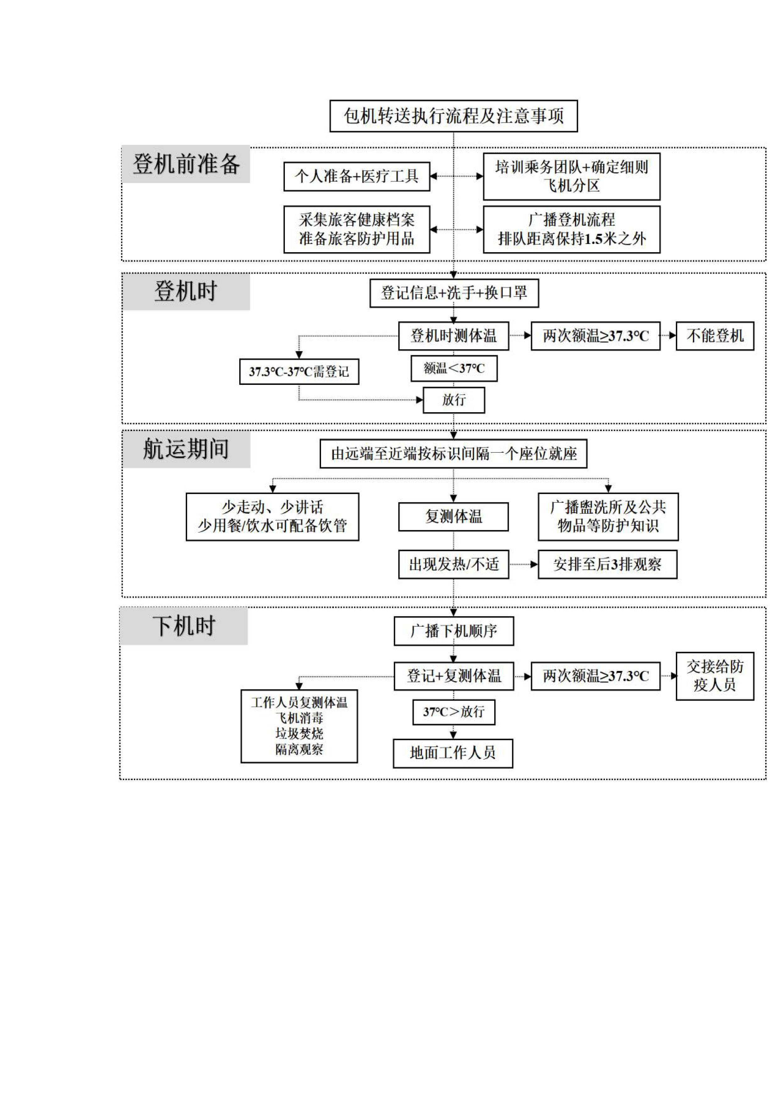 | 图 3 包机转运旅客流程及注意事项 Fig 3 Procedures and notice for preparing, boarding, shipping and disembarkation |