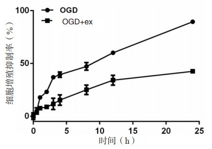构建OGD实验模型,采用2 μg/mL的hucMSC-ex进行共孵育处理,检测不同时间点神经胶质细胞增殖情况。如图 1所示,与OGD组比较,实验组OGD-ex孵育3 h后细胞增殖抑制率明显下降(P < 0.05),提示外泌体可促进缺血缺氧神经胶质细胞增殖率。