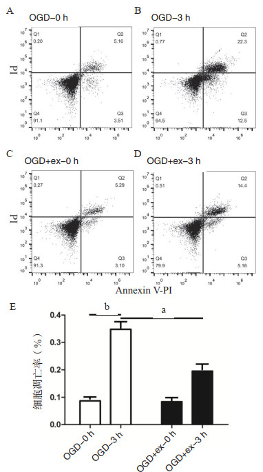构建OGD实验模型,hucMSC-ex进行共孵育处理,依据细胞增殖实验结果,下游选择OGD-3 h进行实验,流式细胞技术检测细胞凋亡。如图 2所示,OGD处理3 h后明显诱导细胞凋亡(P < 0.01);实验组OGD-ex孵育3 h后较对照组OGD-3 h凋亡明显减少(P < 0.05),结果提示外泌体孵育之后可以减少神经胶质细胞凋亡。