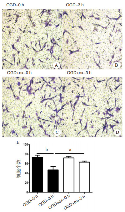 A、B:对照组Transwell实验细胞迁移;C、D:实验组Transwell实验细胞迁移;E:各组细胞迁移个数比较,aP < 0.05,bP < 0.01 图 3 Transwell实验检测神经胶质细胞迁移能力 Fig 3 Effect of hucMSC-ex on the migration capacity of OGD glial cells by Transwell assay