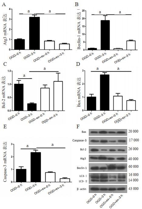 A、B: Real-time PCR检测Atg3、Beclin-1 mRNA表达量水平;C、D、E: Real-time PCR检测Bcl-2、Bax、Caspase-3 mRNA表达量水平;F: Western blot检测相关自噬蛋白及凋亡蛋白表达水平;aP < 0.01 图 4 Real-time PCR技术及Western blot技术检测OGD神经胶质细胞相关自噬基因及凋亡基因mRNA与蛋白水平的表达 Fig 4 Expression of autophagy-related and apoptotic genes mRNA and protein on OGD glial cells by real-time PCR and Western blot