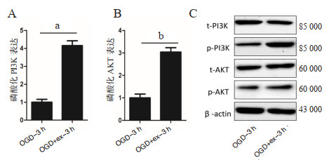 构建OGD实验模型,采用2 μg/mL的hucMSC-ex进行共孵育处理,Western blot检测PI3K/Akt信号通路相关蛋白表达。如图 5所示,共孵育后3 h后,hucMSC-ex可促进OCD模型细胞PI3K(P < 0.01)与Akt(P < 0.05)蛋白磷酸化表达水平。