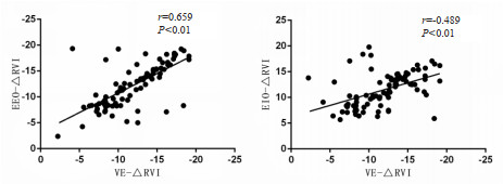 | 图 2 EEO-ΔRVI、EIO-ΔRVI与VE-ΔRVI的相关性分析(n=57) Fig 2 Correlation analysis between EEO-ΔRVI, EIO-ΔRVI and VE-ΔRVI (n=57) |