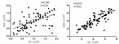 EEO-ΔRVI、EIO-ΔRVI与VE-ΔRVI有相关性(r=0.695,P < 0.01;r=-0.489,P < 0.01);EEO-ΔCVP与VE-ΔCVP有相关性(r=0.566,P < 0.01);EEO-ΔSVV、EIO-ΔSVV与VE-ΔSVV有相关性(r=0.842,P < 0.01;r=-0.727,P < 0.01),见图 2~4。
