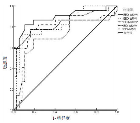 EEO-ΔCVP、VE-ΔCVP、EEO-ΔSVV、EIO-ΔSVV、VE-ΔSVV、EEO-ΔRVI、EIO-ΔRVI、VE-ΔRVI在容量有反应组与无反应组之间比较,差异有统计学意义(均P < 0.05);EIO-ΔCVP、EEO-ΔMAP、EIO-ΔMAP、VE-ΔMAP、EEO-ΔCI、EIO-ΔCI、VE-ΔCI在容量有反应组与无反应组之间比较,差异均无统计学意义(均P > 0.05),见表 2。