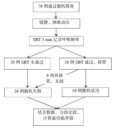 1.2 撤机指标① SBT前静推短效镇痛镇静药物, 患者深镇静, 定容模式, 计算理想体质量, 设潮气量=6 mL/kg, PEEP为0 cmH2O, 频率=15次/min, 吸呼比=1:2, 长按吸气性屏气键两个呼吸周期, 记录Pplat、Ppeak, 长按呼吸性屏气键两个呼吸周期, 记录PEEPtot, DP =Pplat-PEEPtot。②患者完全清醒, 自主呼吸恢复, 开始SBT 3 min, 记录最快RR, 计算Ppeak×RR、DP×RR。本研究所用呼吸机为Puritan Bennett 840(P-B公司, 美国加利福尼亚州)。