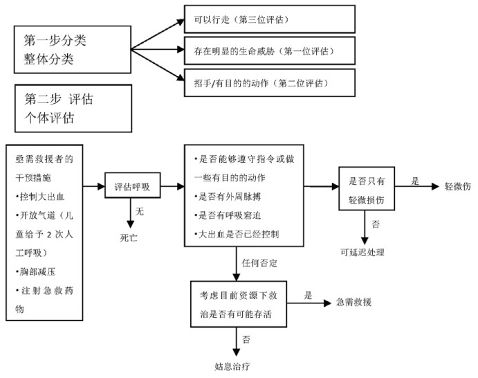 检伤与处置:灾难的发生是突发的、严重的,面对突然大量涌现的伤员,合理疏散、有序分流、资源调配是灾难救援面临的考验,检伤分类是合理调配资源与有序分流与疏散的主要依据。