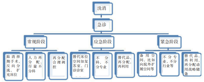 应急能力:是应对灾难来临时的应急缓冲能力,以减少突发事件带来的伤害。灾难导致的大规模人员伤亡,伤员的到来常常呈现出“四波现象”[25],国际灾难生命支持课程将其分为常规阶段、应急阶段、紧急阶段三个阶段[16],强调在不同阶段,人员调配、物资供给、空间扩展等资源分配策略不同。当灾难进入紧急阶段,面对资源的严重紧缺,物资、人员、空间等资源调配将不得已采取一定程度的“破规”策略,人员调配可能会不分专业、不分科室,物资调配面临再回收、再利用或再分配等情况,空间策略可能会启用院外周边的空间等情况。