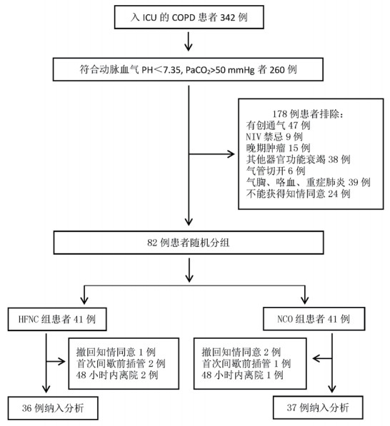 1.2 一般资料筛选进入上述ICU,根据《中国慢性阻塞性肺疾病诊治指南》2013版[1]诊断为AECOPD,且动脉血气pH<7.35,PaCO2>50 mmHg的患者。COPD诊断基于相关病史、查体、胸部影像学及可获得的肺功能检查。排除标准为:①年龄小于18周岁;②需要立即气管插管:呼吸频率>40次/min以上、严重低氧(高浓度吸氧下氧合指数<150)、严重呼吸性酸中毒pH<7.2、意识障碍(格拉斯哥评分<8分)等;③存在NIV禁忌者:口面部创伤、痰多排痰能力差、血流动力学不稳定等;④短期预后不良者,7 d内死亡风险大者,正在进行姑息性治疗;⑤其他器官功能衰竭;⑥气管切开者;⑦合并气胸、咯血、重症肺炎者;⑧不能获得知情同意者。二次排除时剔除下列患者:①撤回知情同意;②在NIV首次间歇期前进行气管插管;③入选后48 h内离院者;④入选后拒绝使用所分配治疗方法者。