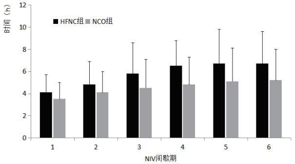 | NIV间歇期平均时间(h) | 6.2±2.9 | 4.9±2.8 | 0.059 |